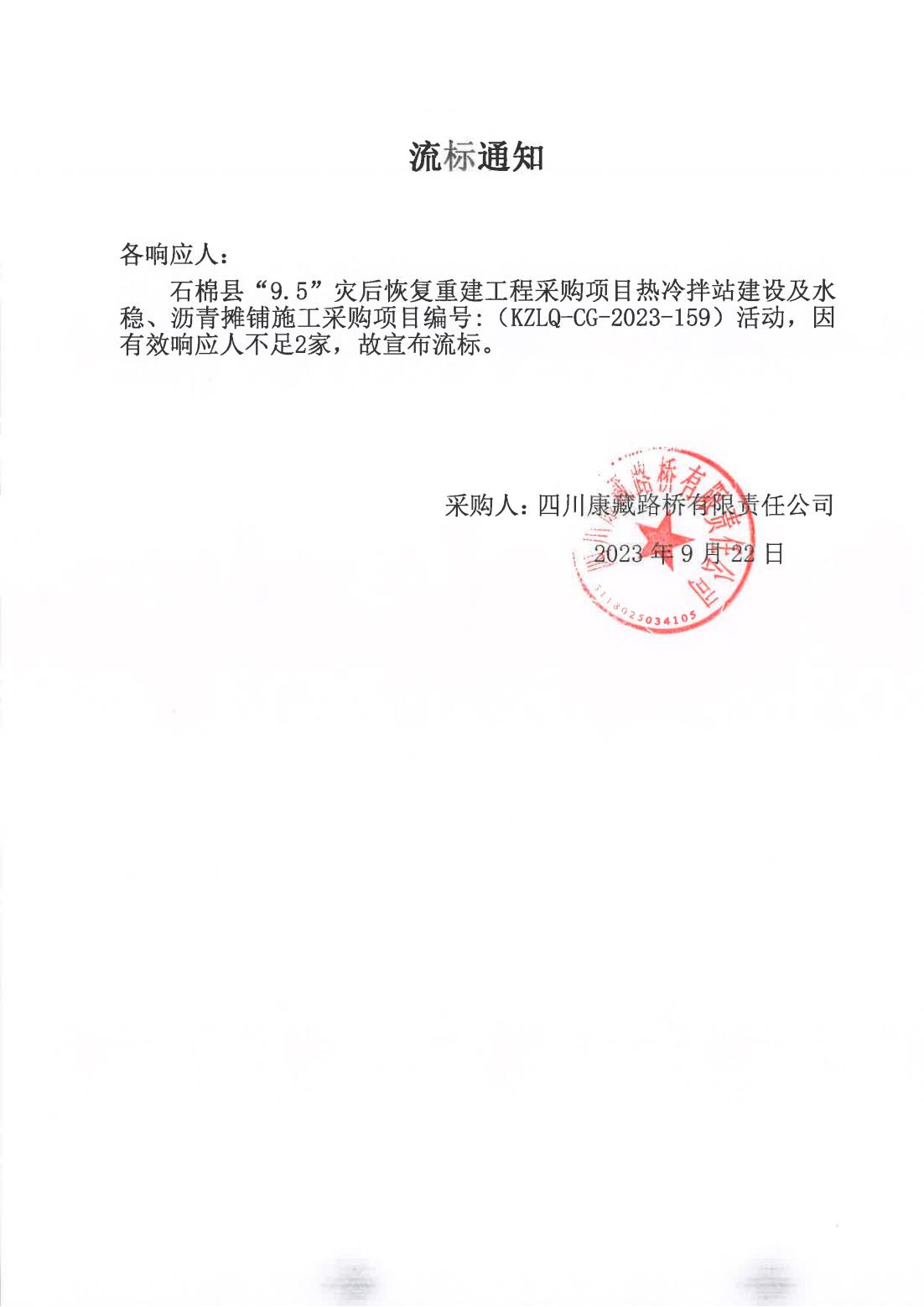 四川康藏路橋有限責(zé)任公司石棉縣“9·5”災(zāi)后恢復(fù)重建工程采購項目熱冷拌站建設(shè)及水穩(wěn)、瀝青攤鋪施工采購流標(biāo)通知