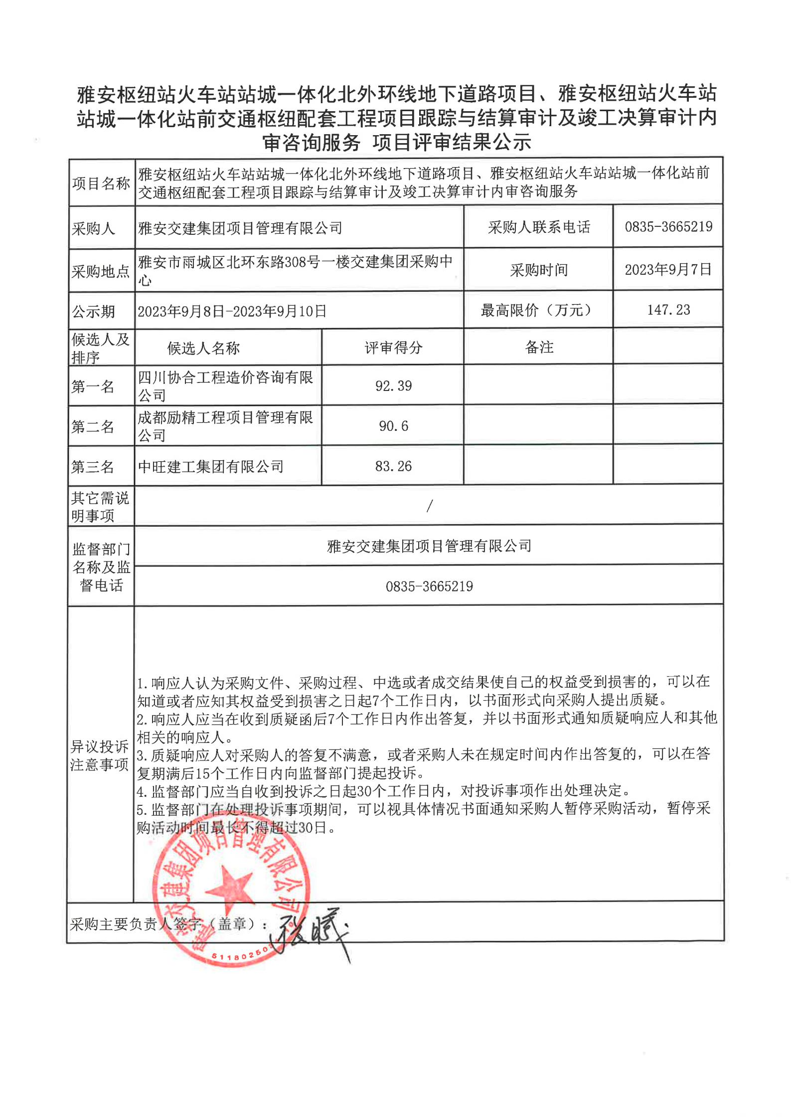 雅安交建集團(tuán)項(xiàng)目管理有限公司雅安樞紐站火車站站城一體化北外環(huán)線地下道路項(xiàng)目、樞紐站火車站站成一體化站前交通樞紐配套工程項(xiàng)目跟蹤與結(jié)算審計(jì)及竣工決算審計(jì)內(nèi)審咨詢服務(wù)項(xiàng)目評(píng)審結(jié)果公示