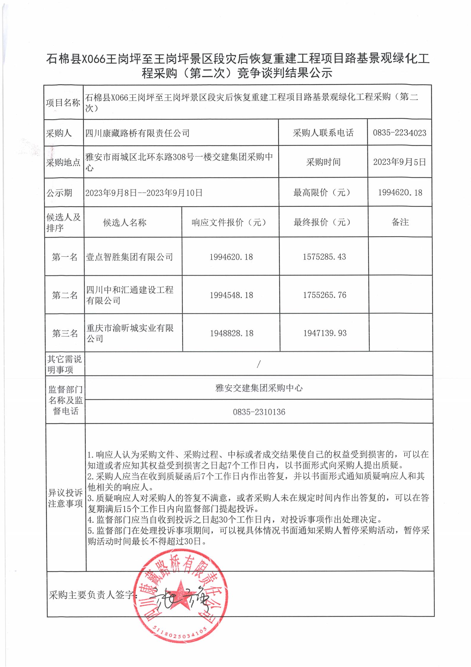 四川康藏路橋有限責任公司石棉縣X066王崗坪至王崗坪景區(qū)段災后恢復重建工程項目路基景觀綠化工程施工采購(第二次)競爭談判結(jié)果公示