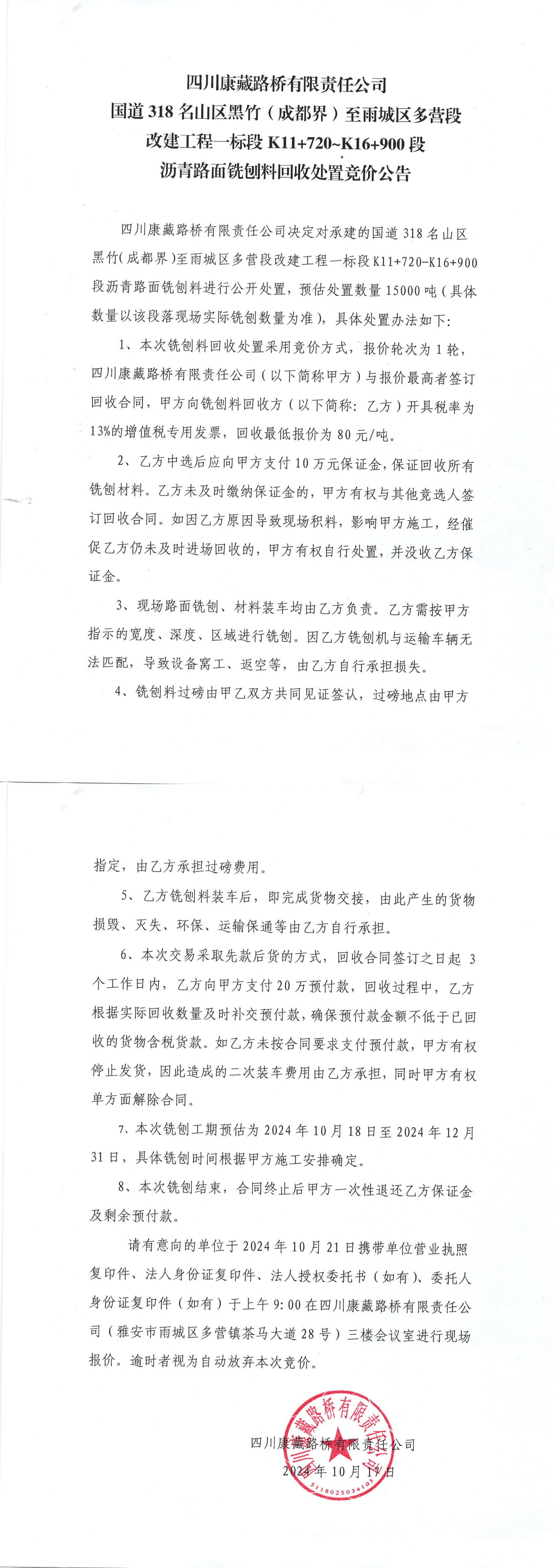 四川康藏路橋有限責(zé)任公司國道318名山區(qū)黑竹(成都界)至雨城區(qū)多營段改建工程一標段K11+720—K16+900段瀝青路面銑刨料回收處置競價公告