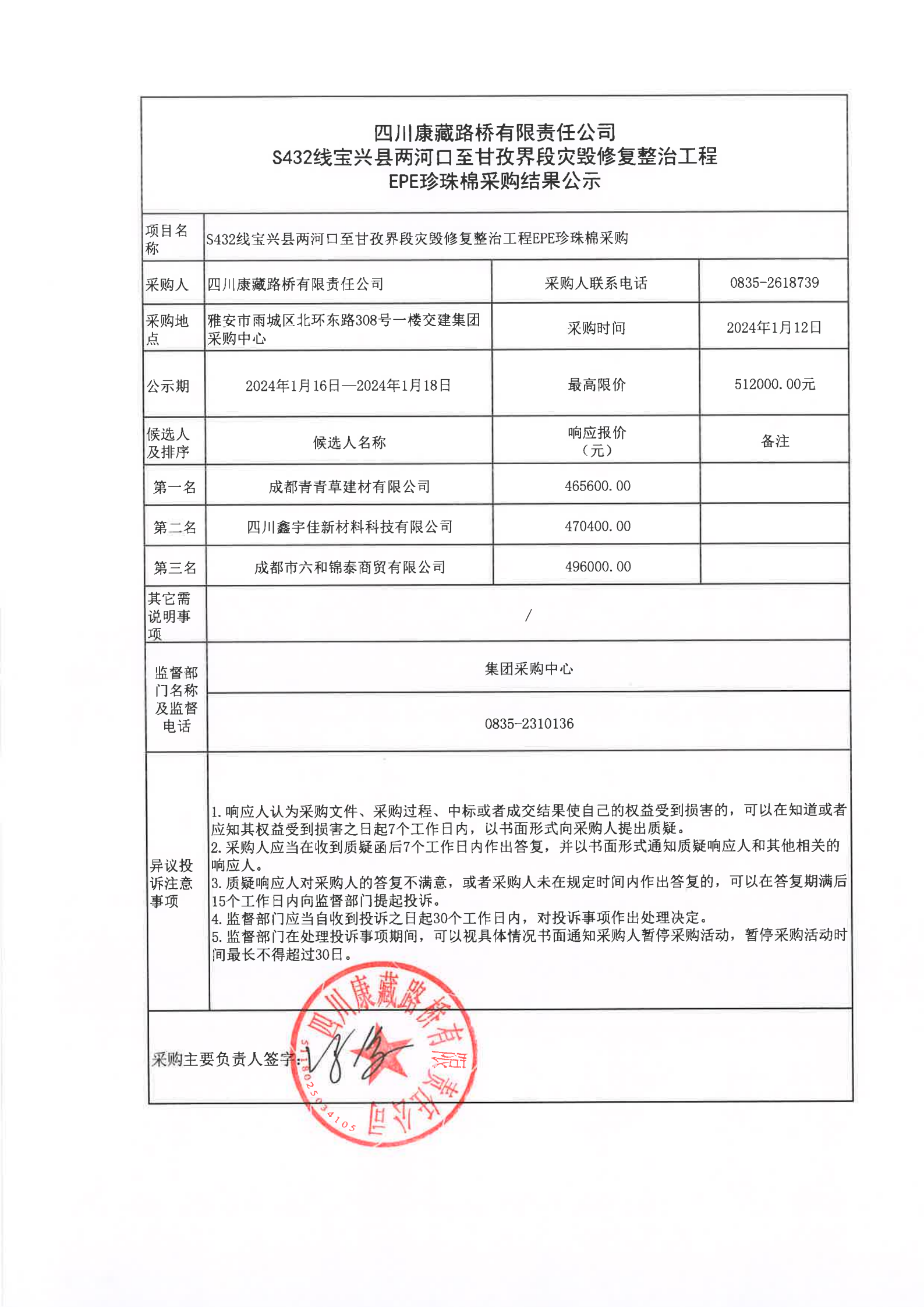 四川康藏路橋有限責任公司S432線寶興縣兩河口至甘孜界段災(zāi)毀修復(fù)整治工程EOE珍珠棉采購結(jié)果公示