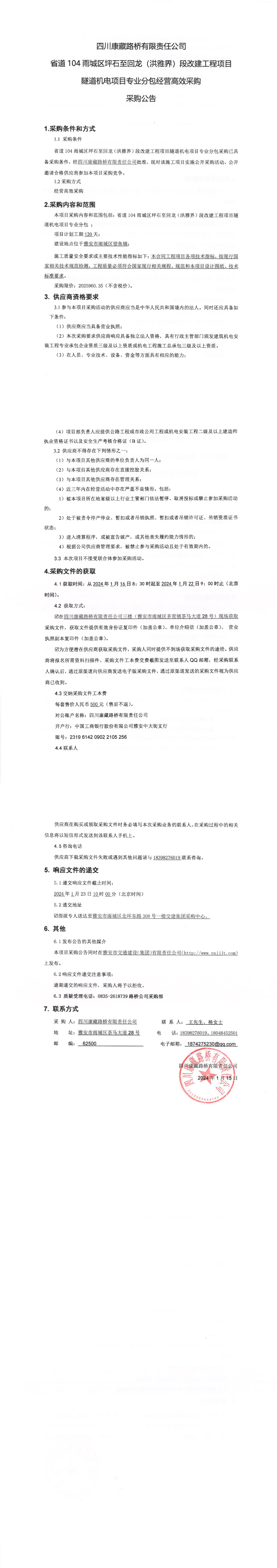 四川康藏路橋有限責任公司省道104雨城區(qū)坪石至回龍(洪雅界)段改建工程項目隧道機電項目專業(yè)分包經(jīng)營高效采購公告