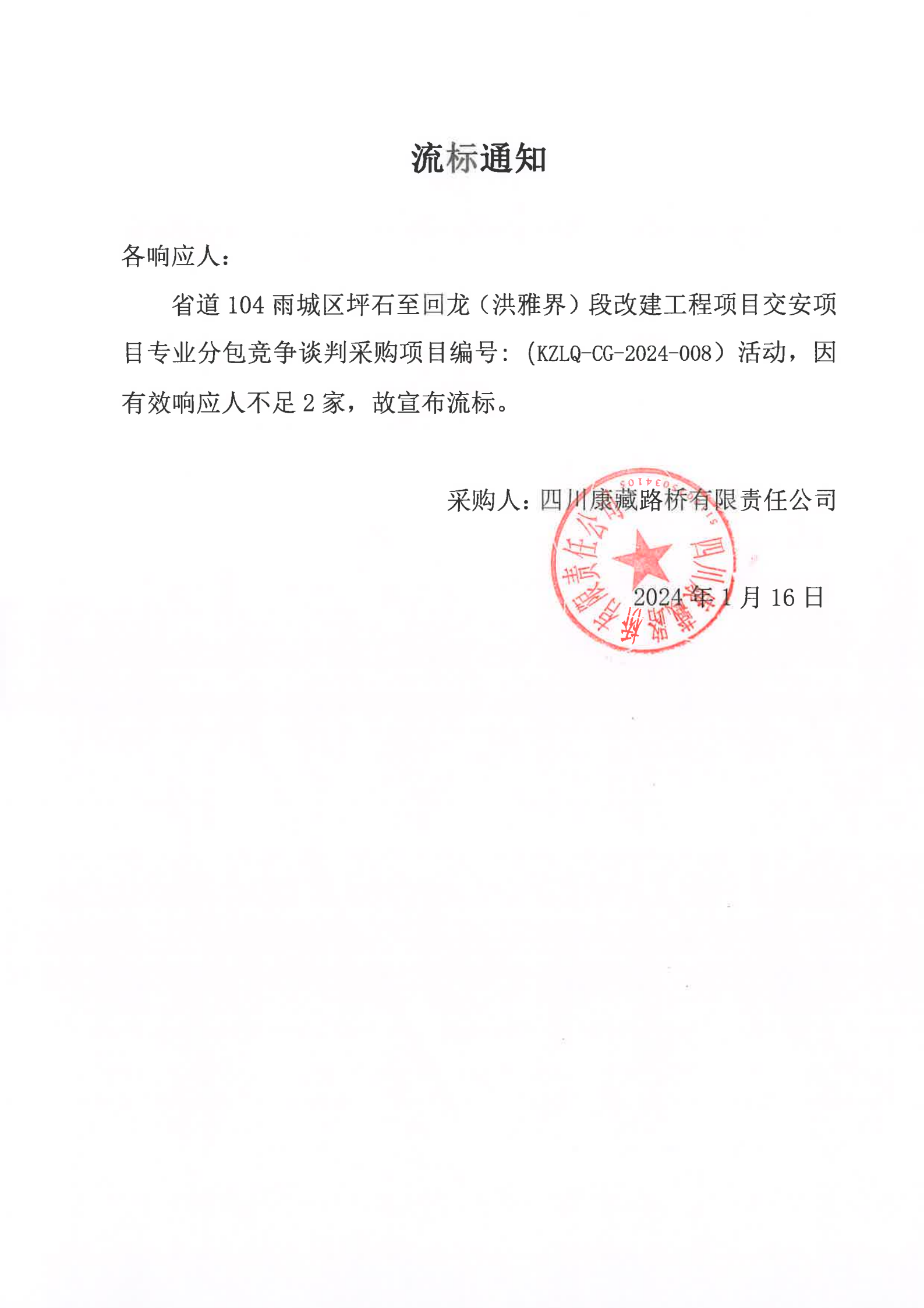 四川康藏路橋有限責(zé)任公司省道104雨城區(qū)坪石至回龍(洪雅界)段改建工程項目交安項目專業(yè)分包競爭談判采購流標(biāo)通知