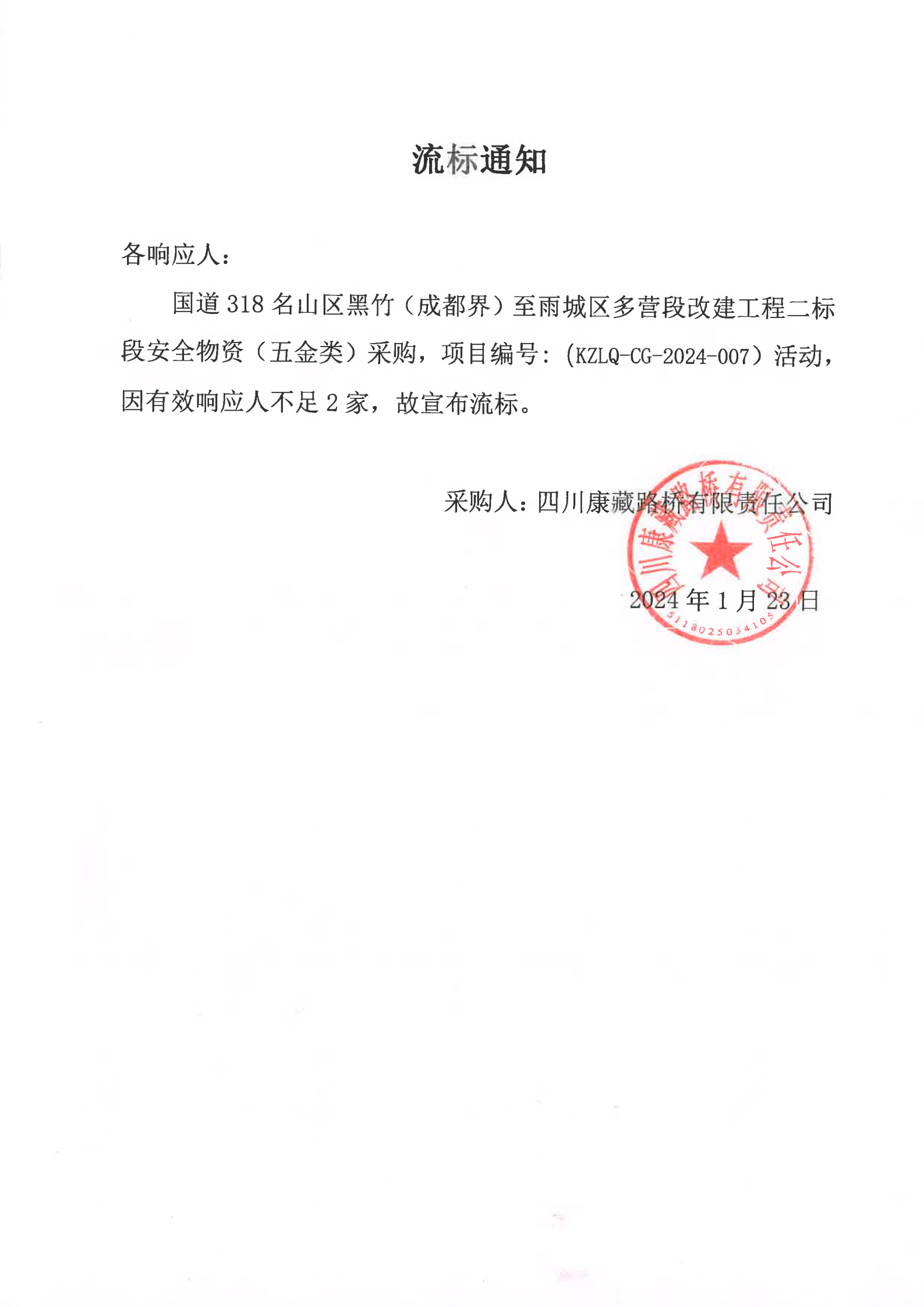 四川康藏路橋有限責(zé)任公司國道318名山區(qū)黑竹(成都界)至雨城區(qū)多營段改建工程二標(biāo)段安全物資(五金類)采購流標(biāo)通知