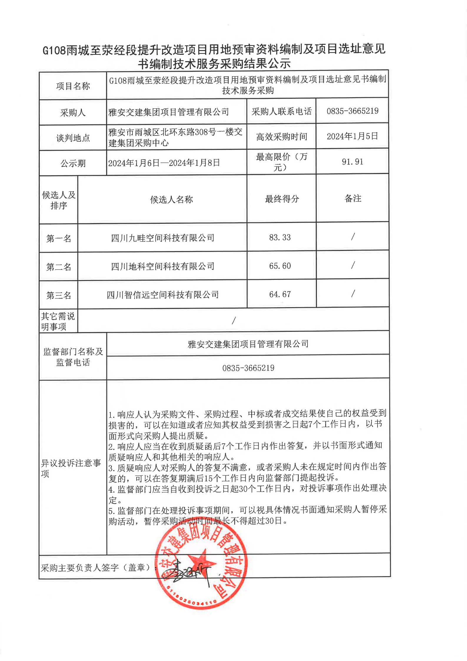 雅安交建集團項目管理有限公司G108雨城至滎經(jīng)段提升改造項目用地預(yù)審資料編制及項目選址意見書編制技術(shù)服務(wù)采購結(jié)果公示