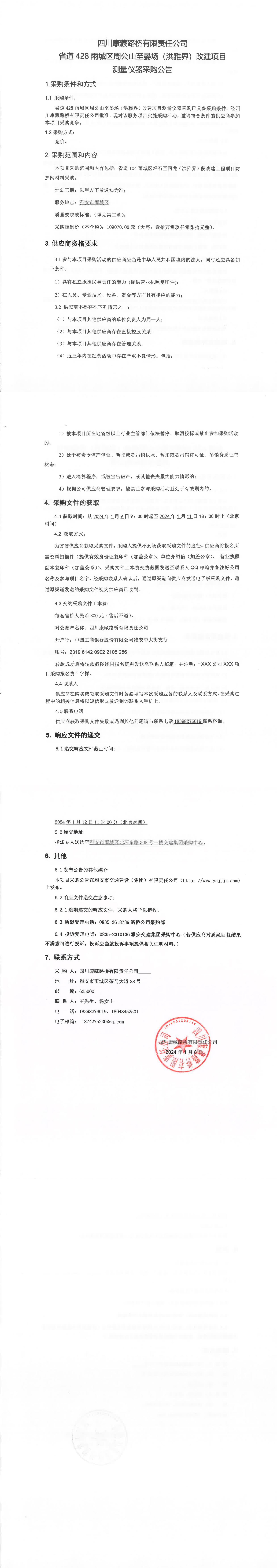 四川康藏路橋有限責任公司省道428雨城區(qū)周公山至晏場(洪雅界)改建項目測量儀器采購公告