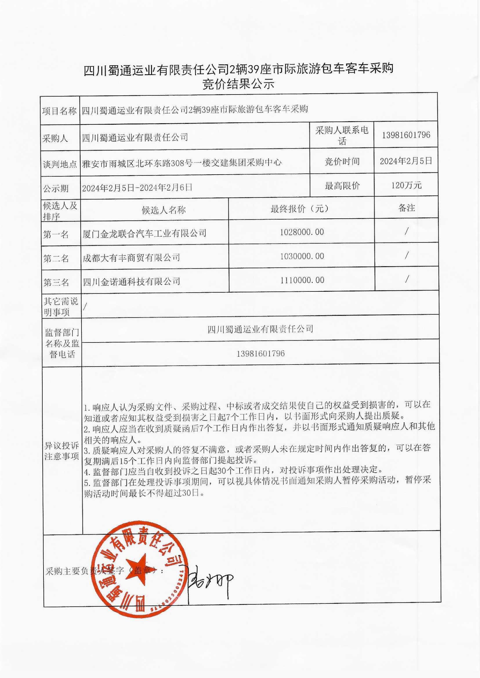 四川蜀通運(yùn)業(yè)有限責(zé)任公司2輛39座市際旅游包車(chē)客車(chē)采購(gòu)競(jìng)價(jià)結(jié)果公示