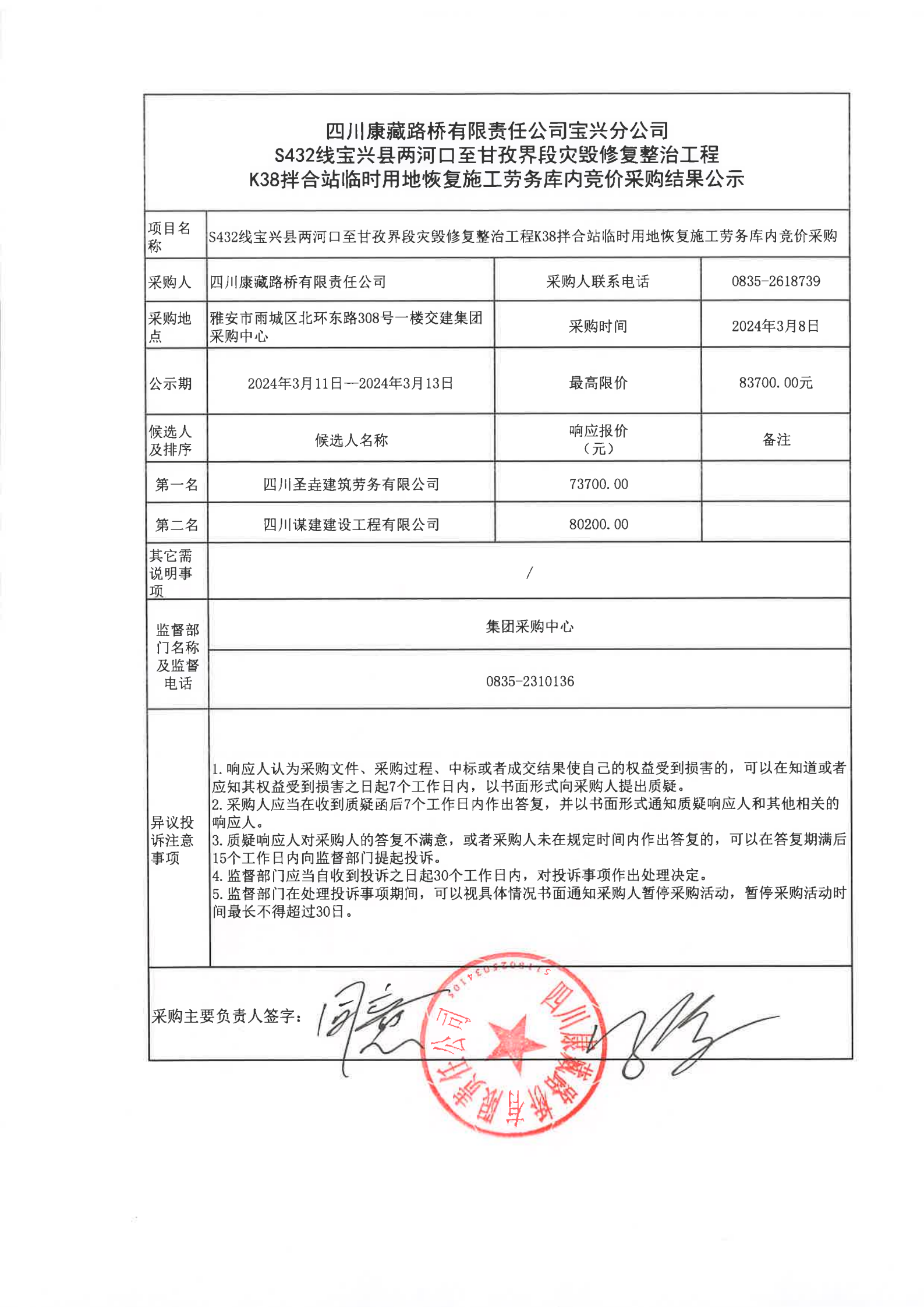 四川康藏路橋有限責(zé)任公司寶興分公司S432線寶興縣兩河口至甘孜界段災(zāi)毀修復(fù)整治工程K10棄土場施工勞務(wù)庫內(nèi)采購結(jié)果公示