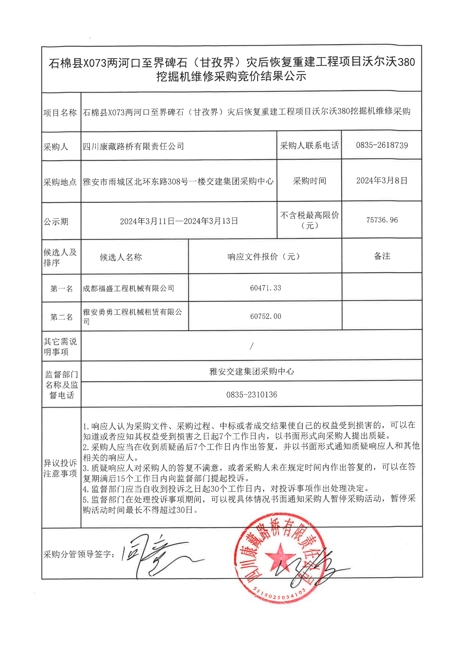 四川康藏路橋有限責(zé)任公司石棉縣X073兩河口至界碑石(甘孜界)災(zāi)后恢復(fù)重建工程項(xiàng)目沃爾沃380挖掘機(jī)維修采購(gòu)競(jìng)價(jià)結(jié)果公示