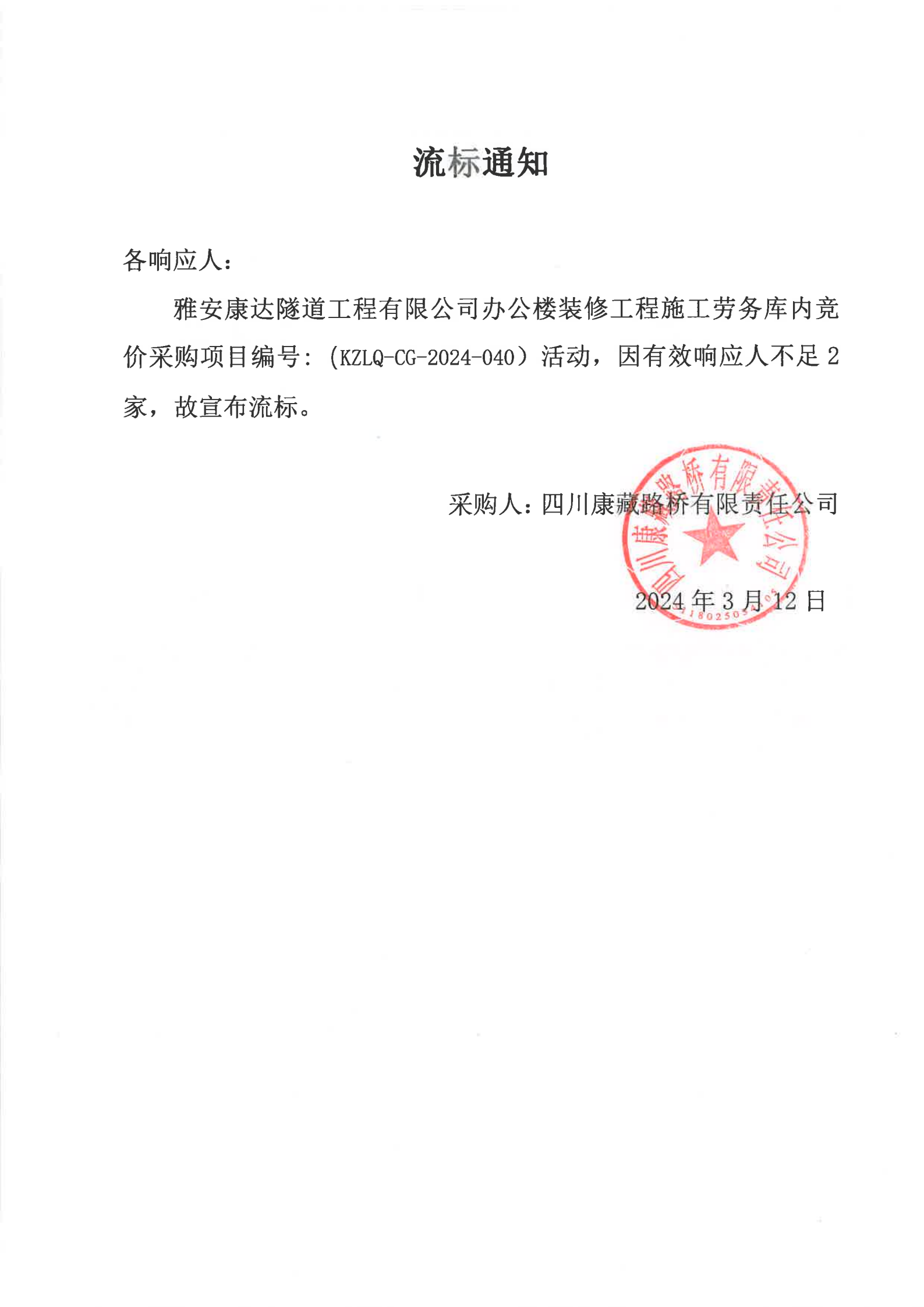 雅安康達隧道工程有限公司辦公樓裝修工程施工勞務(wù)庫內(nèi)競價采購流標(biāo)通知