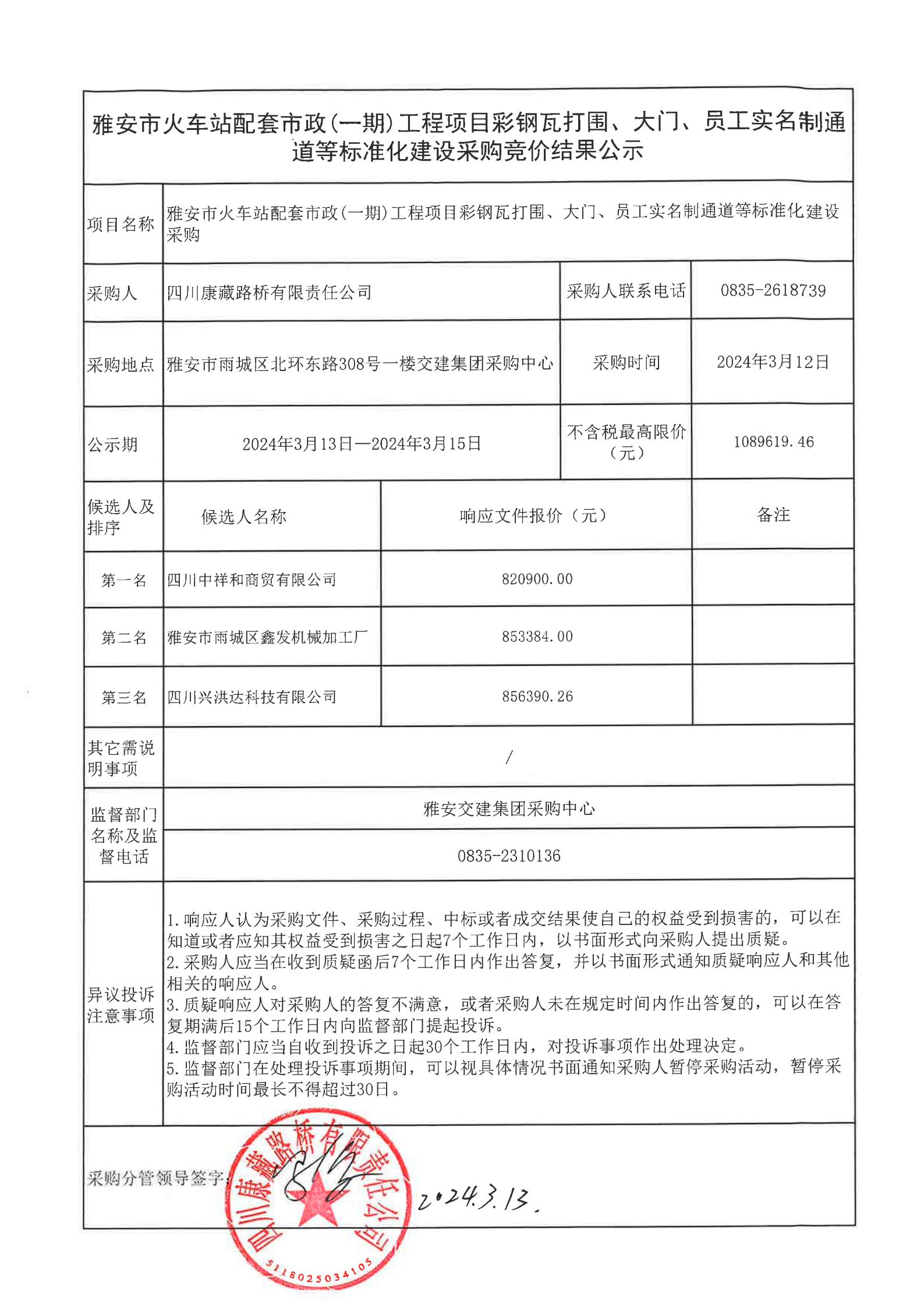 四川康藏路橋有限責任公司雅安市火車站配套市政(一期)工程項目彩鋼瓦打圍、大門、員工實名制通道等標準化建設采購結果公示