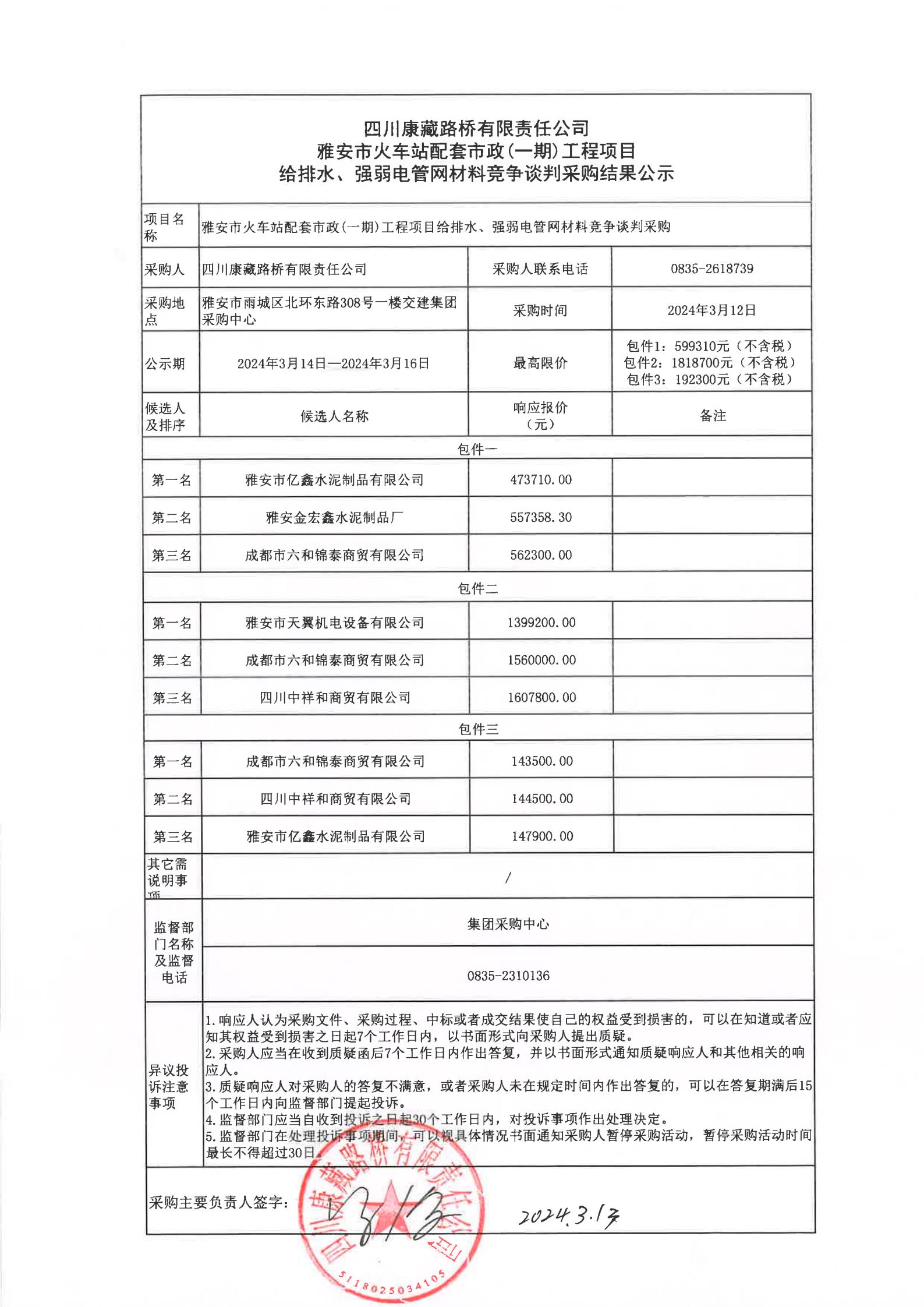 四川康藏路橋有限責任公司雅安市火車站配套市政(一期)工程項目給排水、強弱電管網(wǎng)材料采購結(jié)果公示