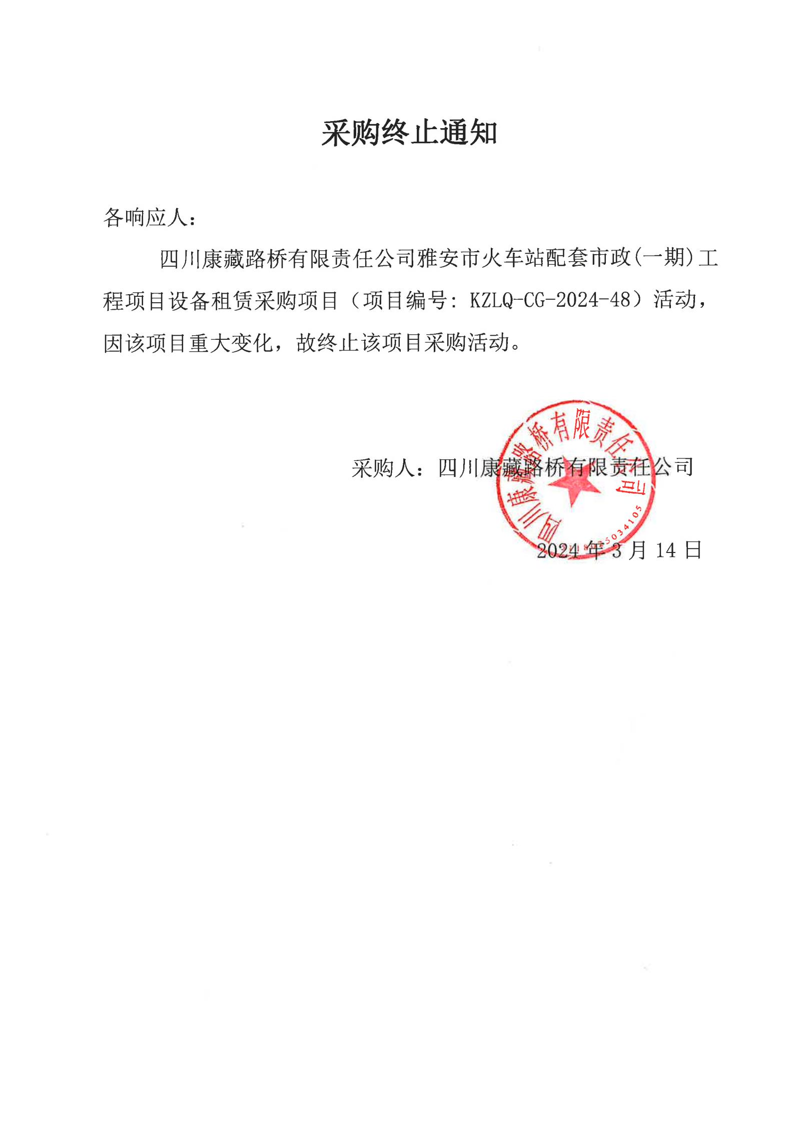 四川康藏路橋有限責(zé)任公司雅安市火車(chē)站配套市政(一期)工程項(xiàng)目設(shè)備租賃采購(gòu)終止通知