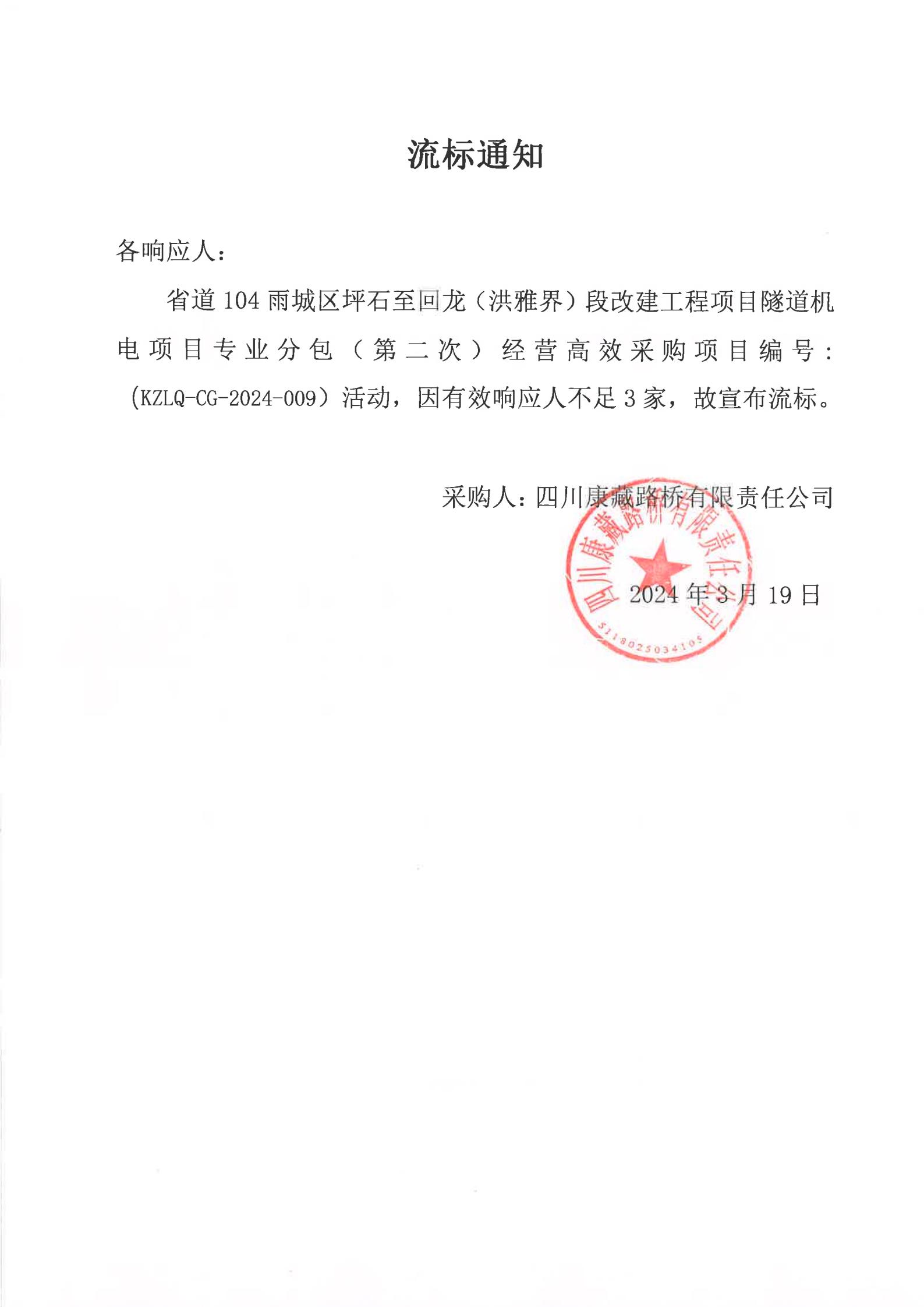 四川康藏路橋有限責(zé)任公司省道104雨城區(qū)坪石至回龍(洪雅界)段改建工程項(xiàng)目隧道機(jī)電項(xiàng)目專(zhuān)業(yè)分包經(jīng)營(yíng)高效采購(gòu)(第二次)流標(biāo)通知