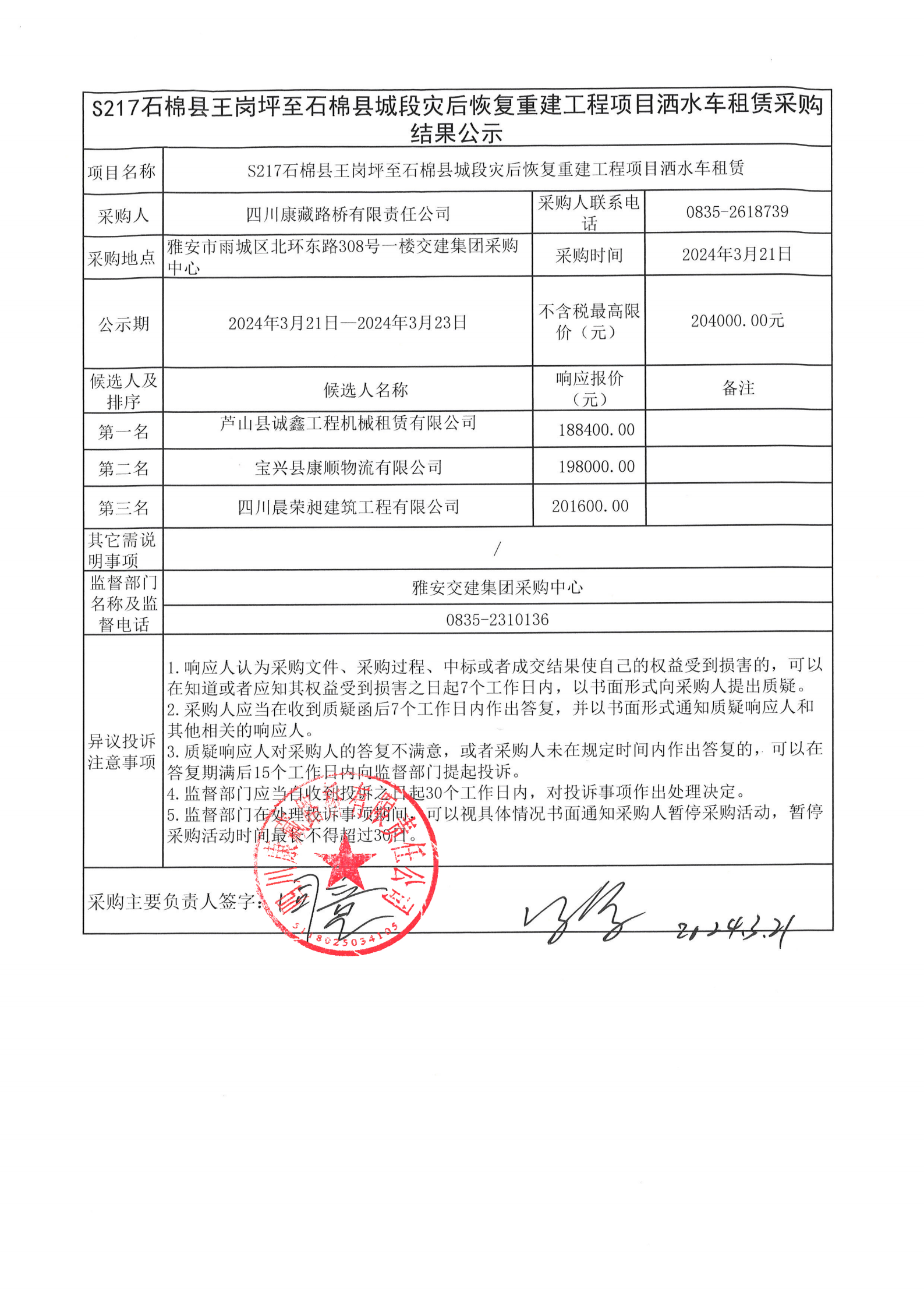 四川康藏路橋有限責任公司S217石棉縣王崗坪至石棉縣城段災后恢復重建工程項目灑水車租賃采購結(jié)果公示