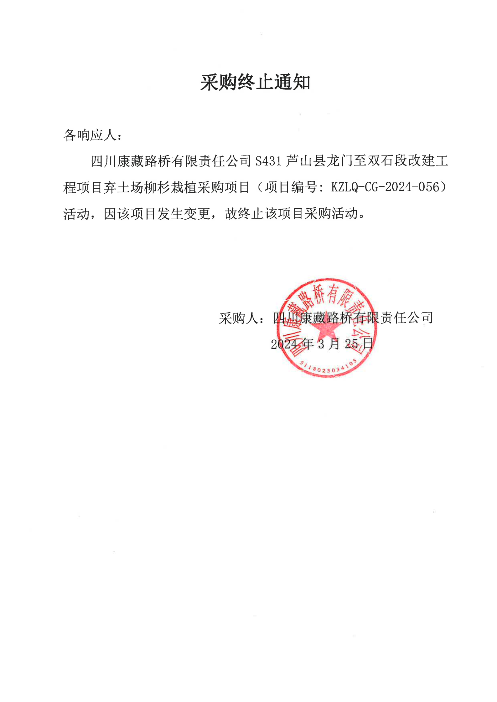 四川康藏路橋有限責(zé)任公司S431蘆山縣龍門鎮(zhèn)至雙石段改建工程項目棄土場柳杉載植采購終止通知
