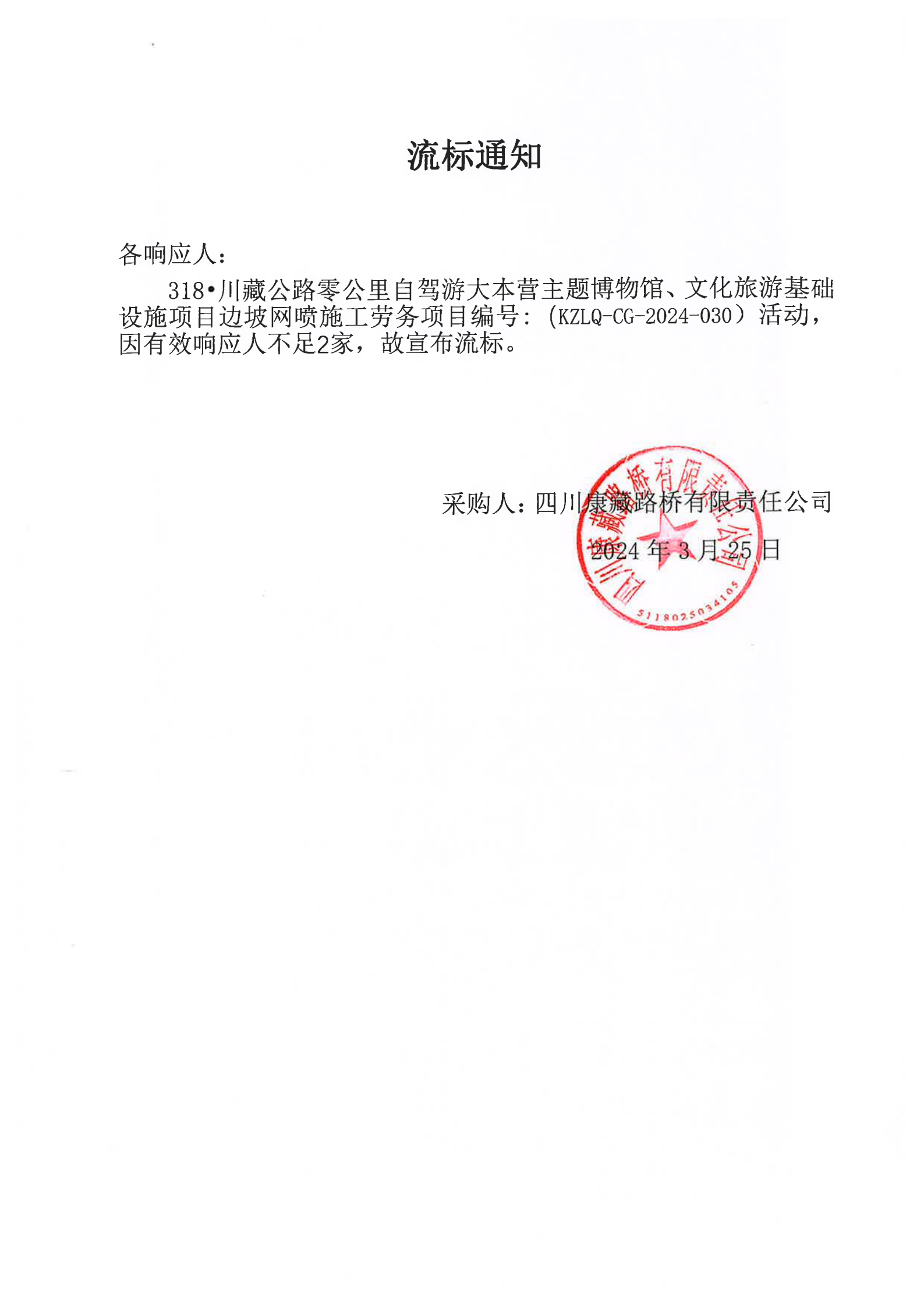 四川康藏路橋有限責(zé)任公司318·川藏公路零公里自駕游大本營主題博物館、文化旅游基礎(chǔ)設(shè)施項目邊坡網(wǎng)噴施工勞務(wù)流標(biāo)通知