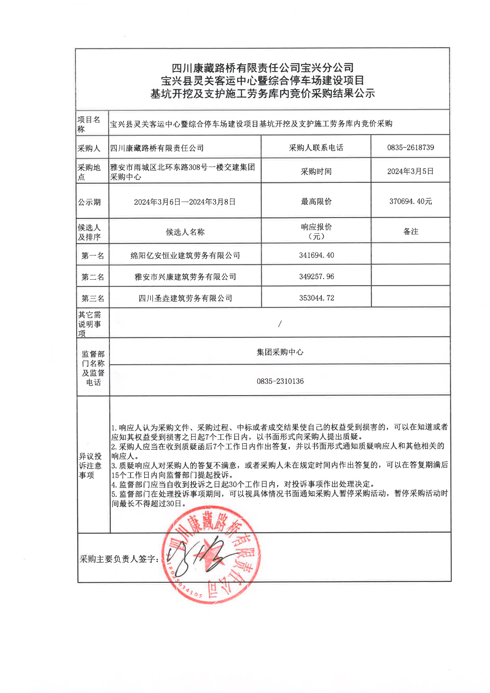 四川康藏路橋有限責任公司寶興分公司寶興縣靈關客運中心暨綜合停車場建設項目基坑開挖及支護施工勞務庫內競價采購結果公示