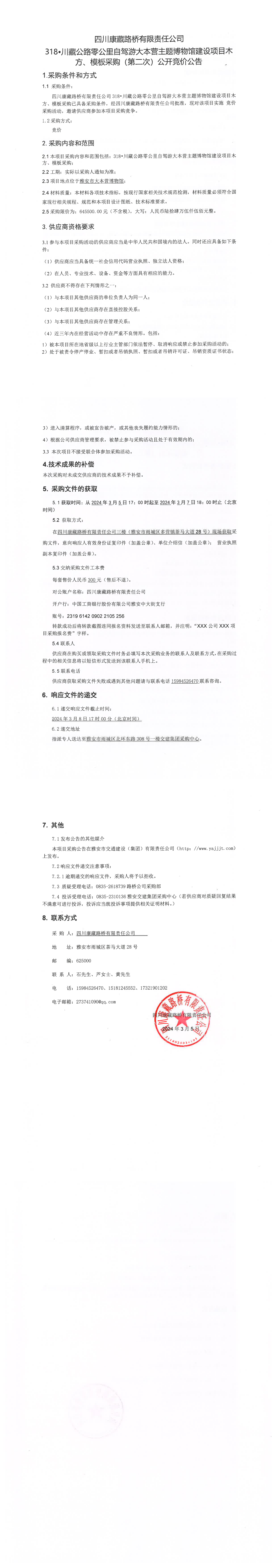 四川康藏路橋有限責任公司318·川藏公路零公里自駕游大本營主題博物館建設項目木方、模板采購(第二次)公開競價公告