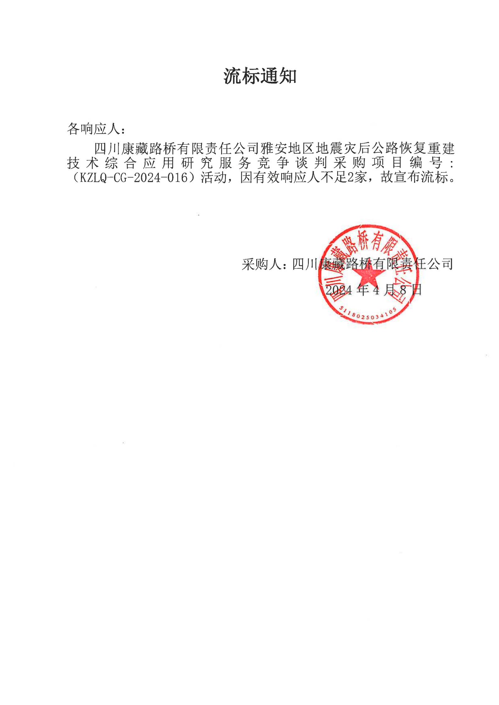 四川康藏路橋有限責任公司雅安地區(qū)地震災(zāi)后公路恢復(fù)重建技術(shù)綜合應(yīng)用研究服務(wù)流標通知