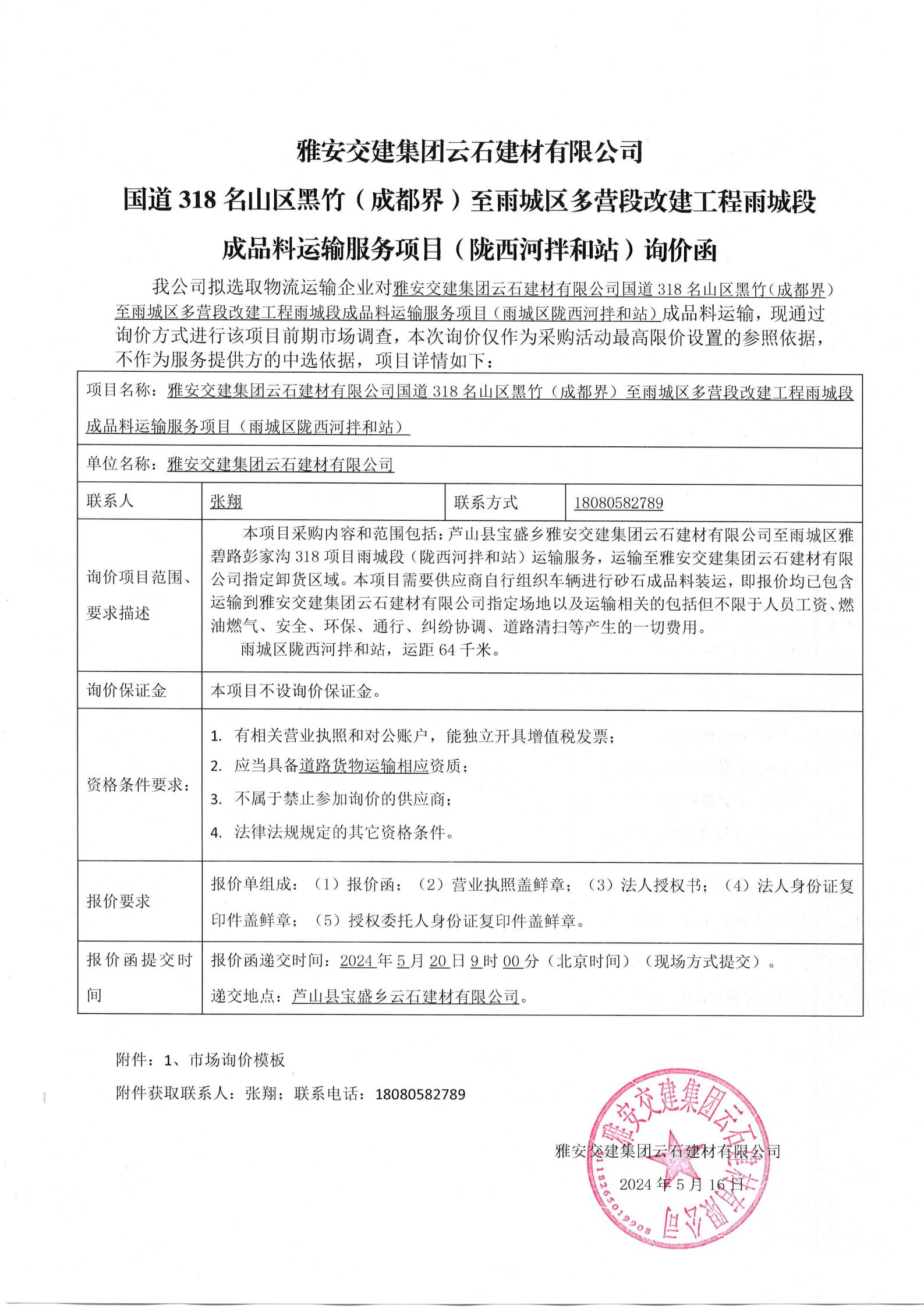 雅安交建集團(tuán)云石建材有限公司國道318名山區(qū)黑竹(成都界)至雨城區(qū)多營段改建工程雨城段成品料運(yùn)輸服務(wù)項(xiàng)目(雨城區(qū)隴西河拌和站)詢價(jià)函