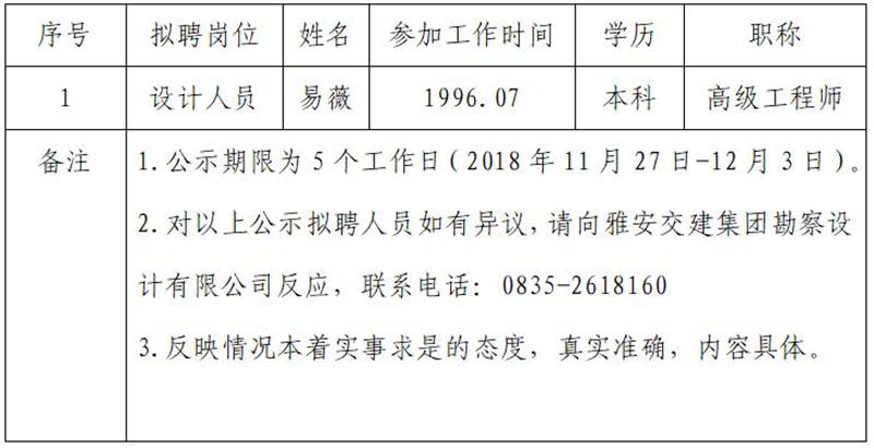 雅安交建集團(tuán)勘察設(shè)計有限公司擬聘用人員公示