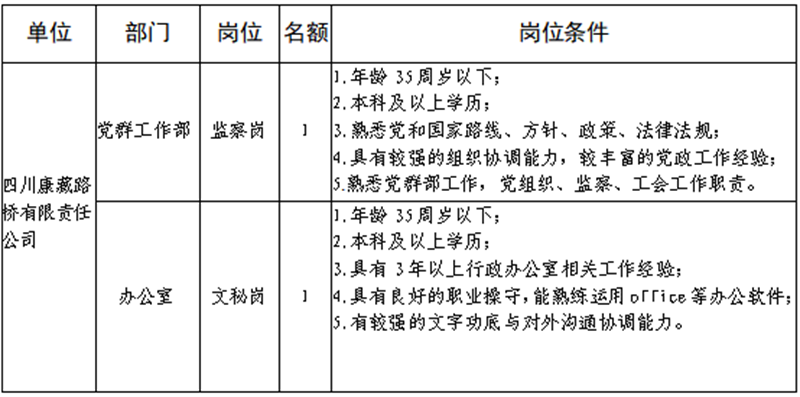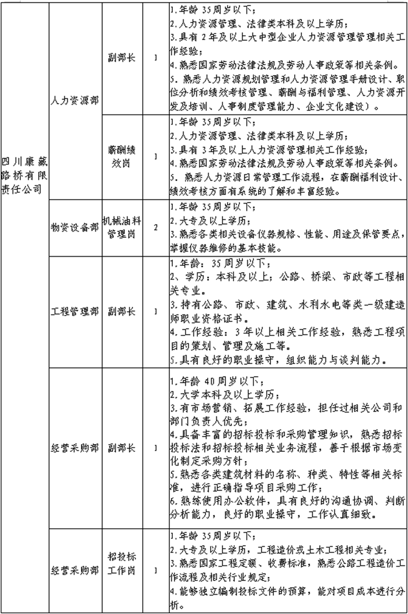根據(jù)發(fā)展需要,決定面向社會公開招聘雅安市交通建設(集團)有限責任公司(以下簡稱“雅安交建集團”)所屬子公司工作人員16名,現(xiàn)將有關事項公告如下: