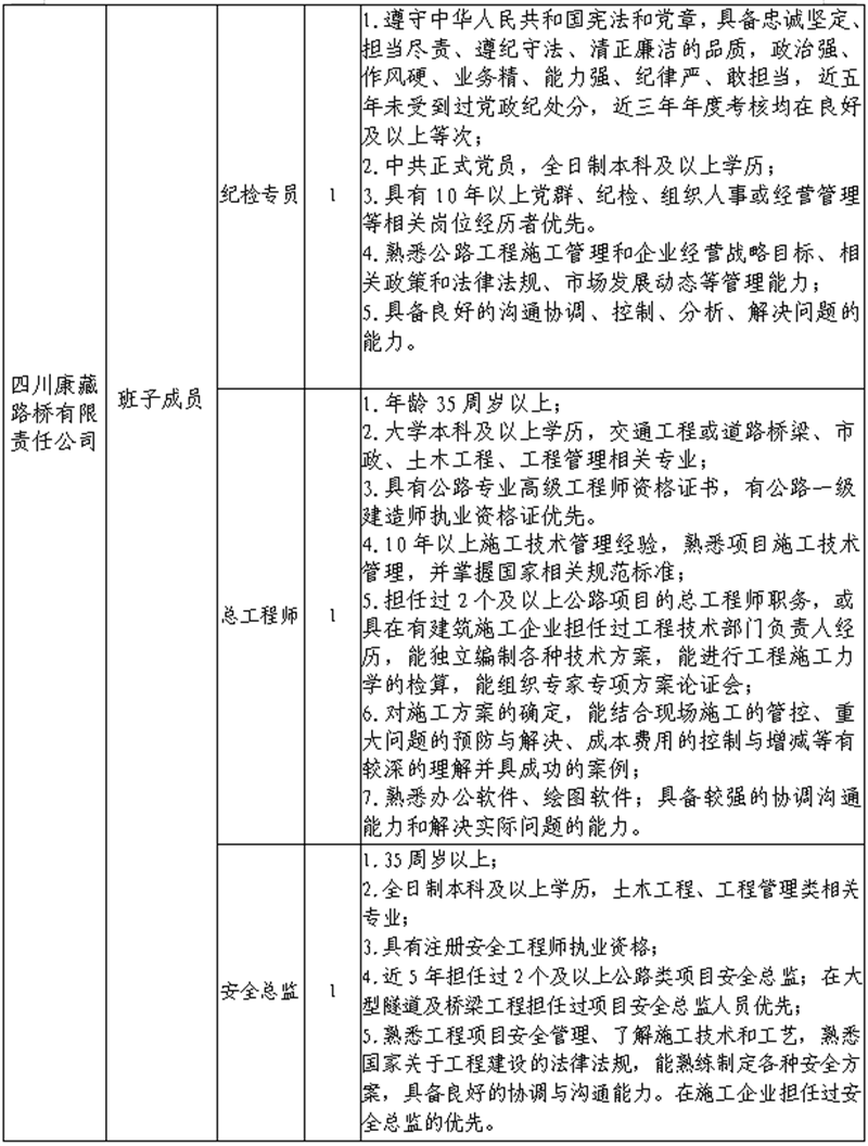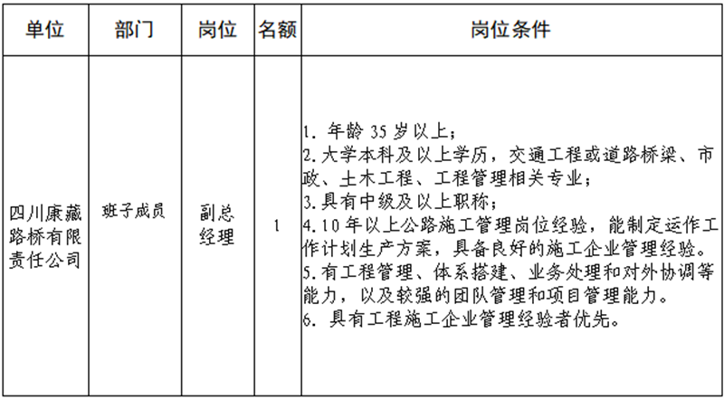 根據(jù)發(fā)展需要,決定面向社會(huì)公開(kāi)招聘雅安市交通建設(shè)(集團(tuán))有限責(zé)任公司(以下簡(jiǎn)稱(chēng)“雅安交建集團(tuán)”)所屬子公司班子成員4名,現(xiàn)將有關(guān)事項(xiàng)公告如下: