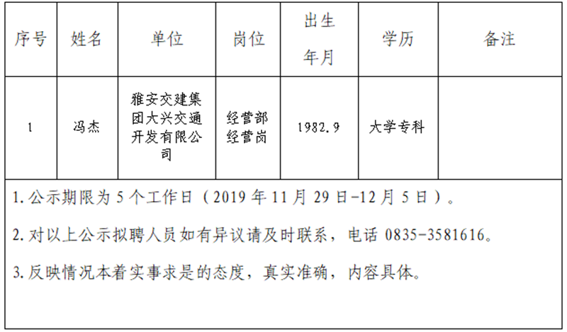 雅安交建集團(tuán)子公司擬聘用人員公示(大興公司)