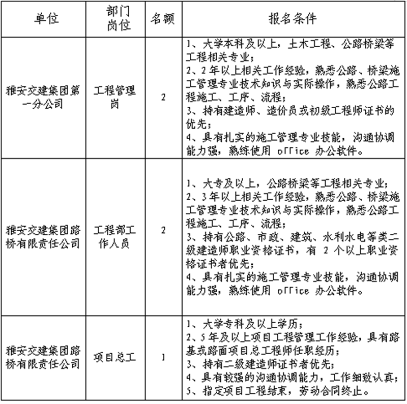 根據(jù)發(fā)展需要,決定面向社會(huì)公開招聘雅安市交通建設(shè)(集團(tuán))有限責(zé)任公司(以下簡(jiǎn)稱“雅安交建集團(tuán)”)所屬分子公司工作人員5名,現(xiàn)將有關(guān)事項(xiàng)公告如下:
