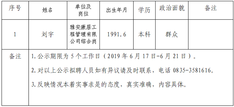 雅安交建集團子公司擬聘用人員公示 (康居公司)