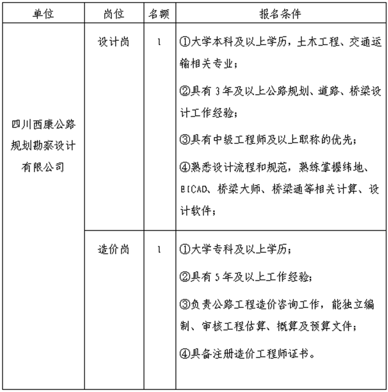 根據發(fā)展需要,決定面向社會公開招聘雅安市交通建設(集團)有限責任公司(以下簡稱“雅安交建集團”)所屬子公司工作人員2名,現將有關事項公告如下: