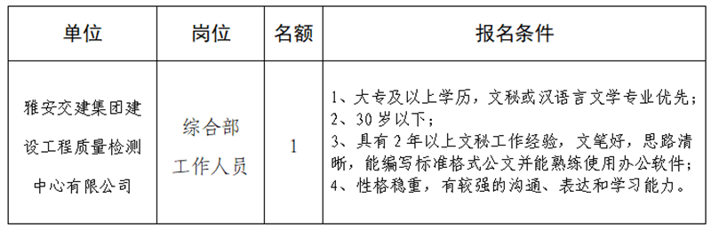 根據(jù)發(fā)展需要,決定面向社會公開招聘雅安市交通建設(集團)有限責任公司(以下簡稱“雅安交建集團”)所屬子公司工作人員1名,現(xiàn)將有關事項公告如下: