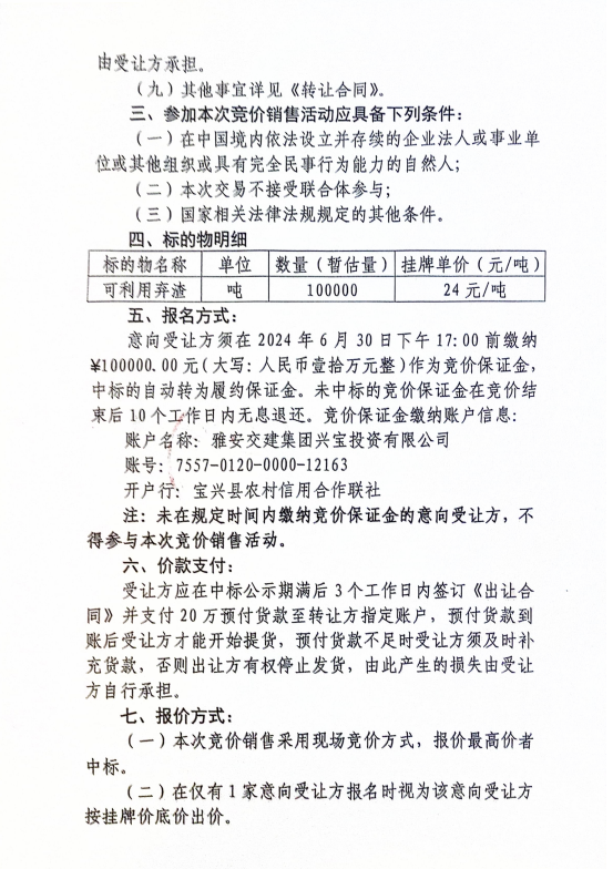 雅安交建集團(tuán)興寶投資有限公司寶興縣靈關(guān)鎮(zhèn)代碑寺土地整理項目10萬噸可利用棄渣競價銷售公告(2024.6.21)
