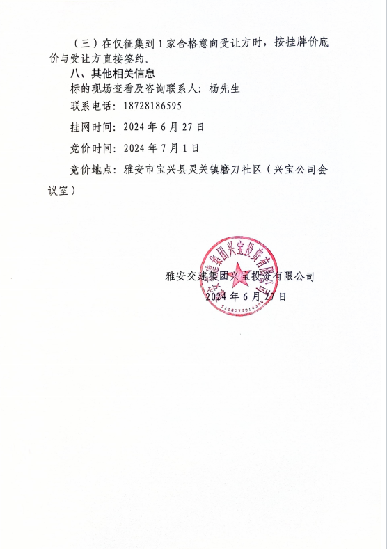 雅安交建集團(tuán)興寶投資有限公司寶興縣靈關(guān)鎮(zhèn)代碑寺土地整理項目10萬噸可利用棄渣競價銷售公告(2024.6.27)