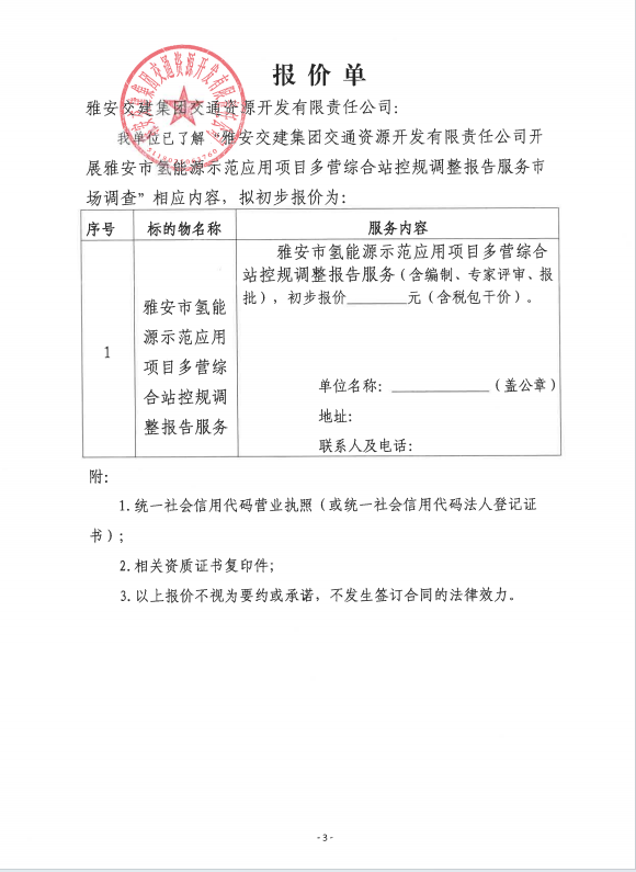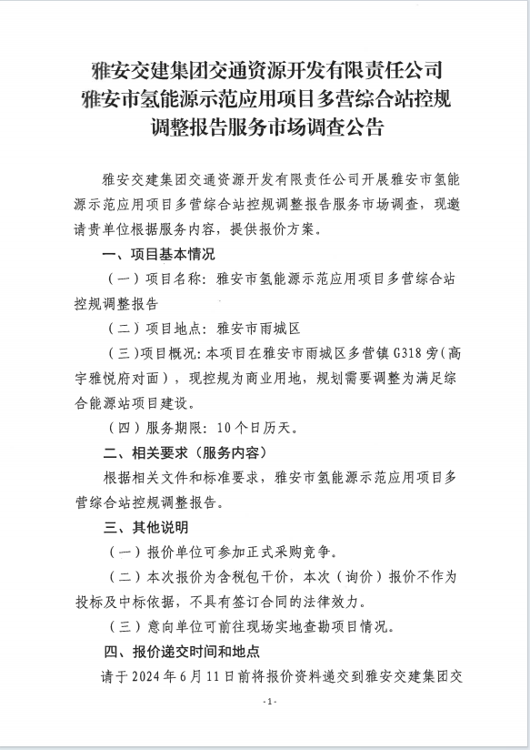 雅安交建集團(tuán)交通資源開發(fā)有限責(zé)任公司雅安市氫能源示范應(yīng)用項目多營綜合站控規(guī)調(diào)整報告服務(wù)市場調(diào)查公告