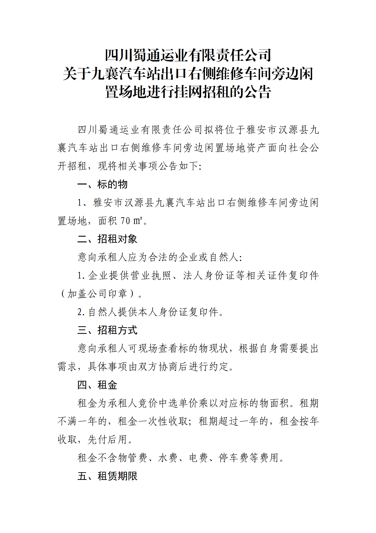 四川蜀通運(yùn)業(yè)有限責(zé)任公司 關(guān)于九襄汽車站出口右側(cè)維修車間旁邊閑置場(chǎng)地進(jìn)行掛網(wǎng)招租的公告
