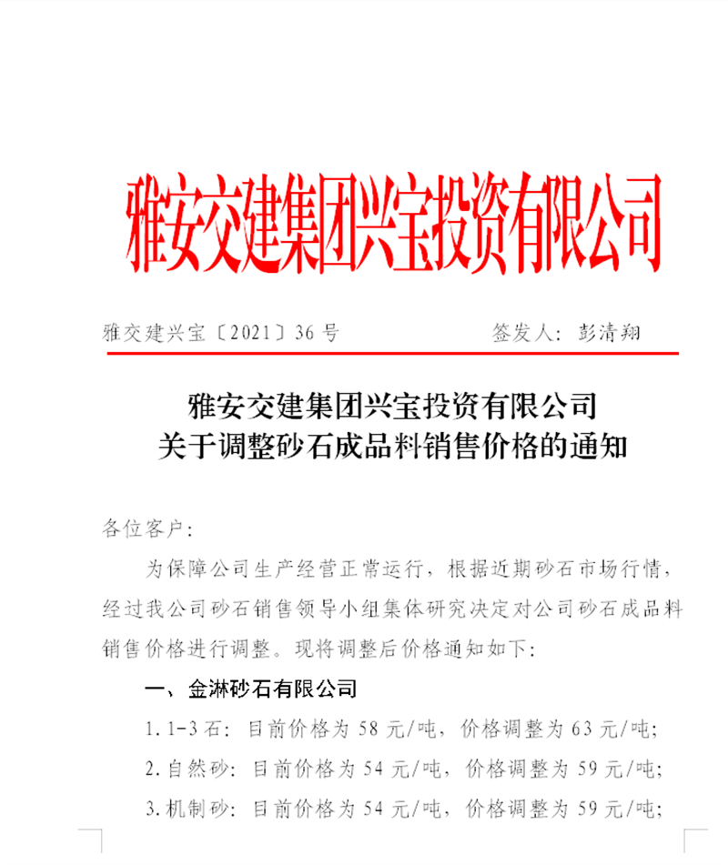 雅安交建集團興寶公司砂石骨料銷售價格情況表(2021.5.22)