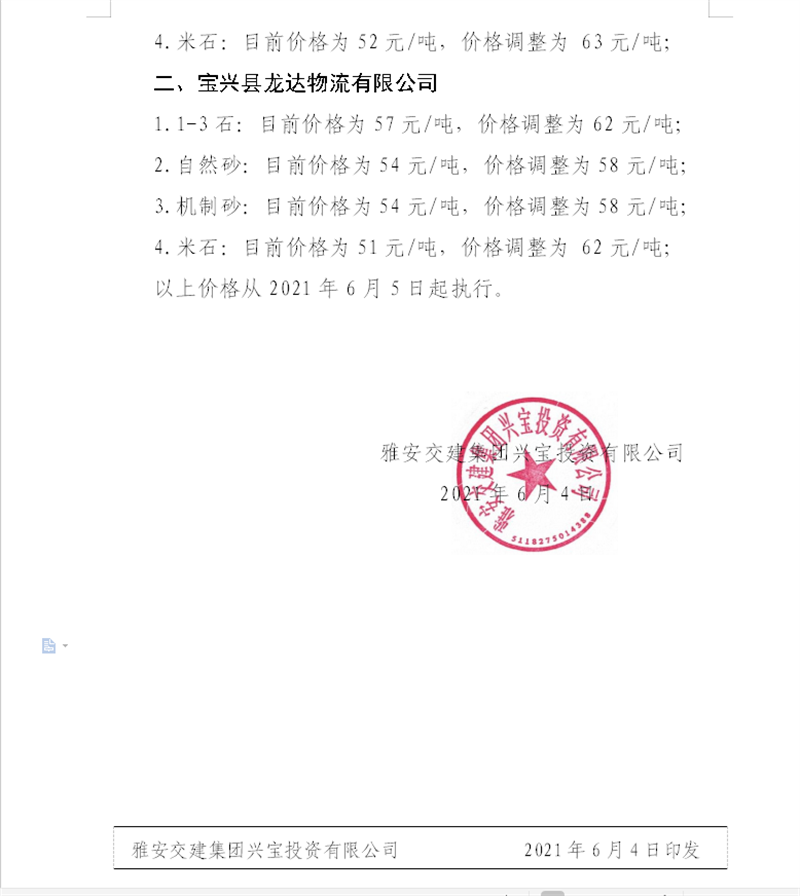 雅安交建集團興寶公司砂石骨料銷售價格情況表(2021.6.5)