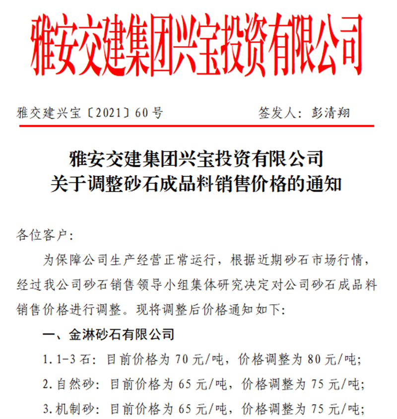 雅安交建集團興寶公司關(guān)于調(diào)整成品料銷售價格的通知(2021.9.17)