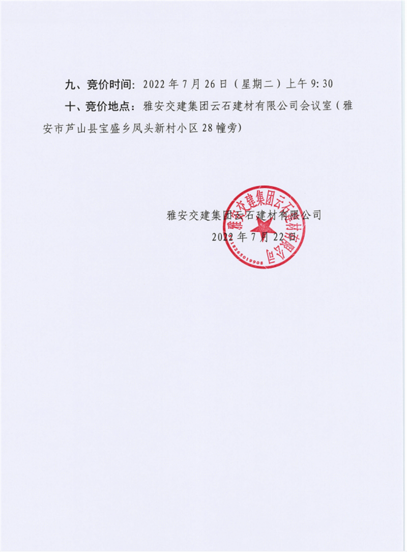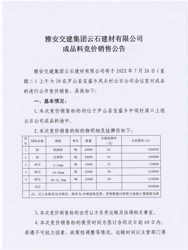 雅安交建集團(tuán)云石建材有限公司成品料競(jìng)價(jià)銷(xiāo)售公告