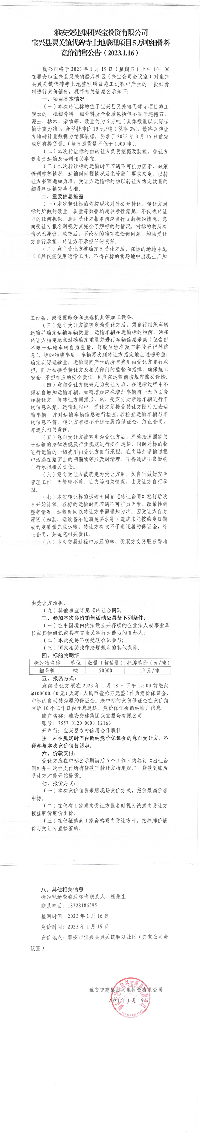 雅安交建集團(tuán)興寶投資有限公司寶興縣靈關(guān)鎮(zhèn)代碑寺土地整理項目5萬噸細(xì)骨料競價銷售公告(2023.01.16)