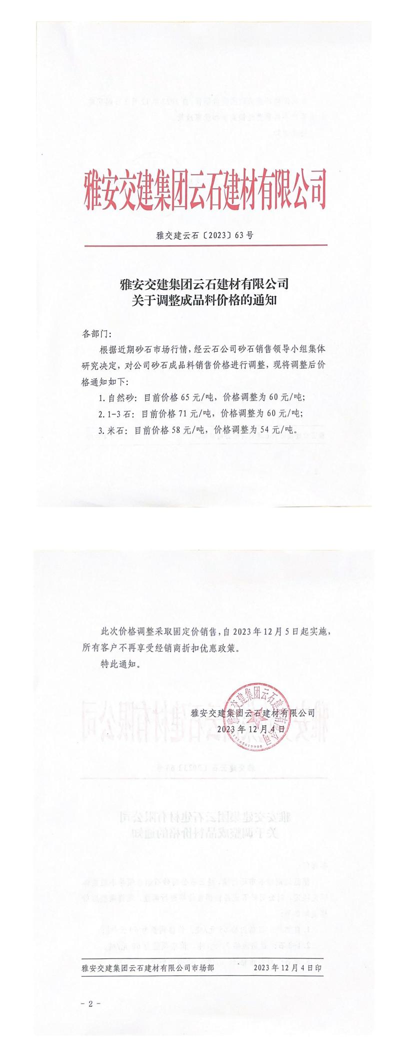 雅安交建集團云石建材有限公司成品料銷售價格調(diào)整公告(2023-12-04)