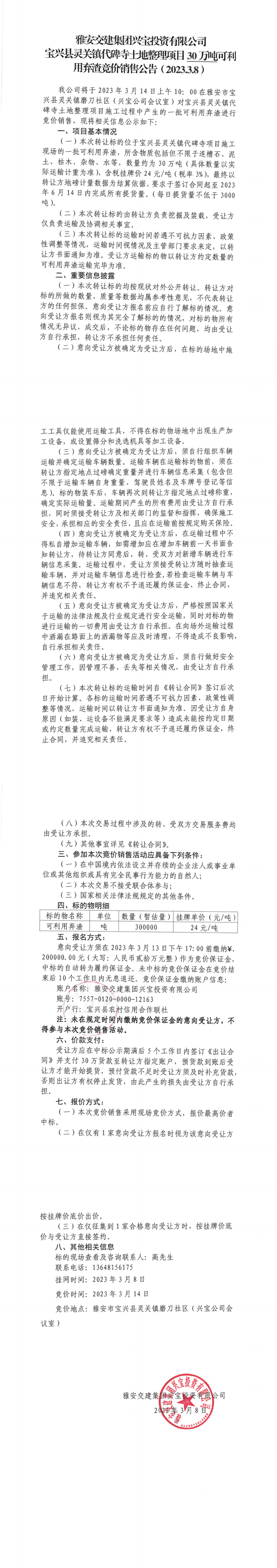 雅安交建集團興寶投資有限公司靈關(guān)鎮(zhèn)代碑寺土地整理項目30萬噸可利用棄渣競價銷售公告(2023.3.8)
