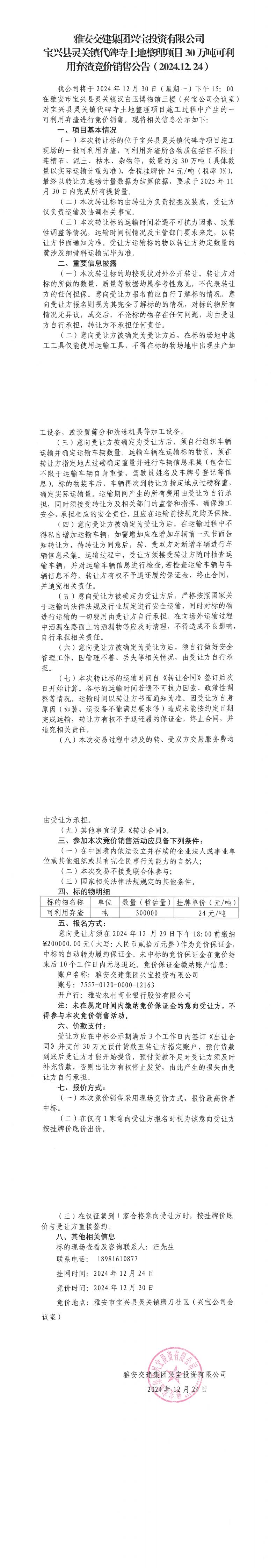 雅安交建集團(tuán)興寶投資有限公司靈關(guān)鎮(zhèn)代碑寺土地整理項(xiàng)目30萬(wàn)噸可利用棄渣競(jìng)價(jià)銷(xiāo)售公告(2024.12.24)