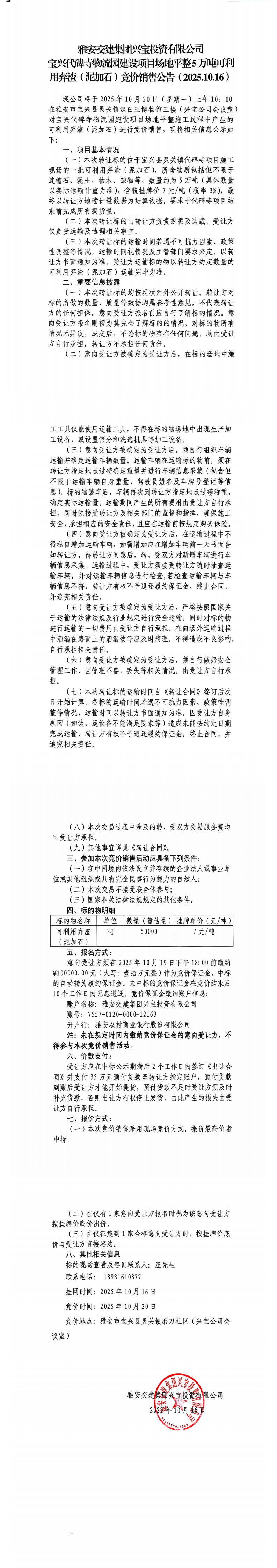 雅安交建集團(tuán)興寶投資有限公司寶興代碑寺物流園建設(shè)項(xiàng)目場(chǎng)地平整5萬噸可利用棄渣(泥加石)競(jìng)價(jià)銷售公告(2025.10.16)