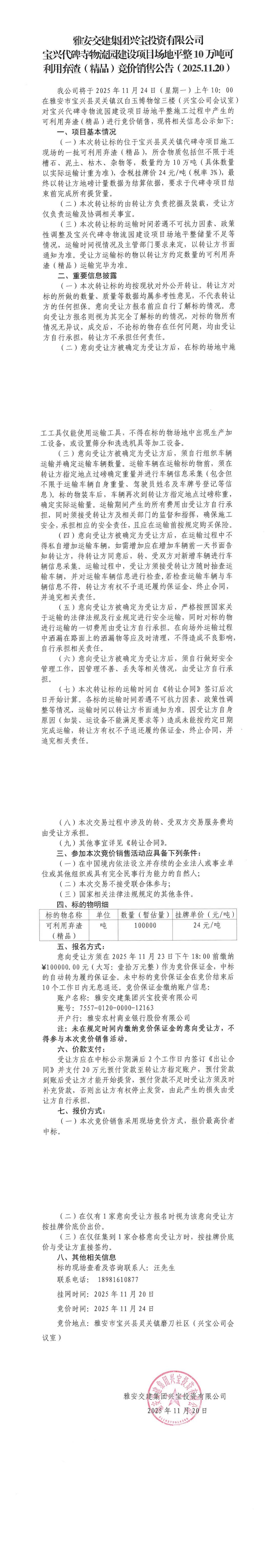 雅安交建集團興寶投資有限公司寶興代碑寺物流園建設(shè)項目場地平整10萬噸可利用棄渣(精品)競價銷售公告(2025.11.20)